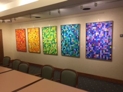 I painted these panels after working with quilt patterns for years. I used 50 tubes of Liquidtex Modular Colors (pre-mixed acrylic paints) and divided them into six areas of the spectrum. Each panel has hues within a narrow range of the spectrum and are arranged randomly with a few squares of contrasting colors thrown in. The dots in corners are an adaptation of the Drunkard's Path quilt pattern shown below.